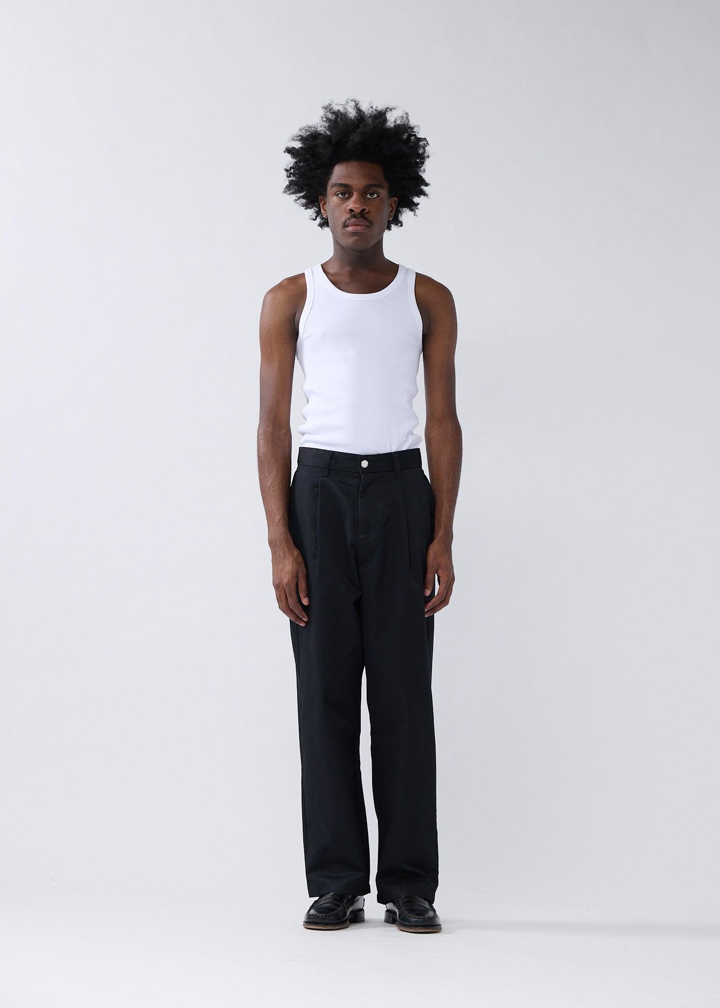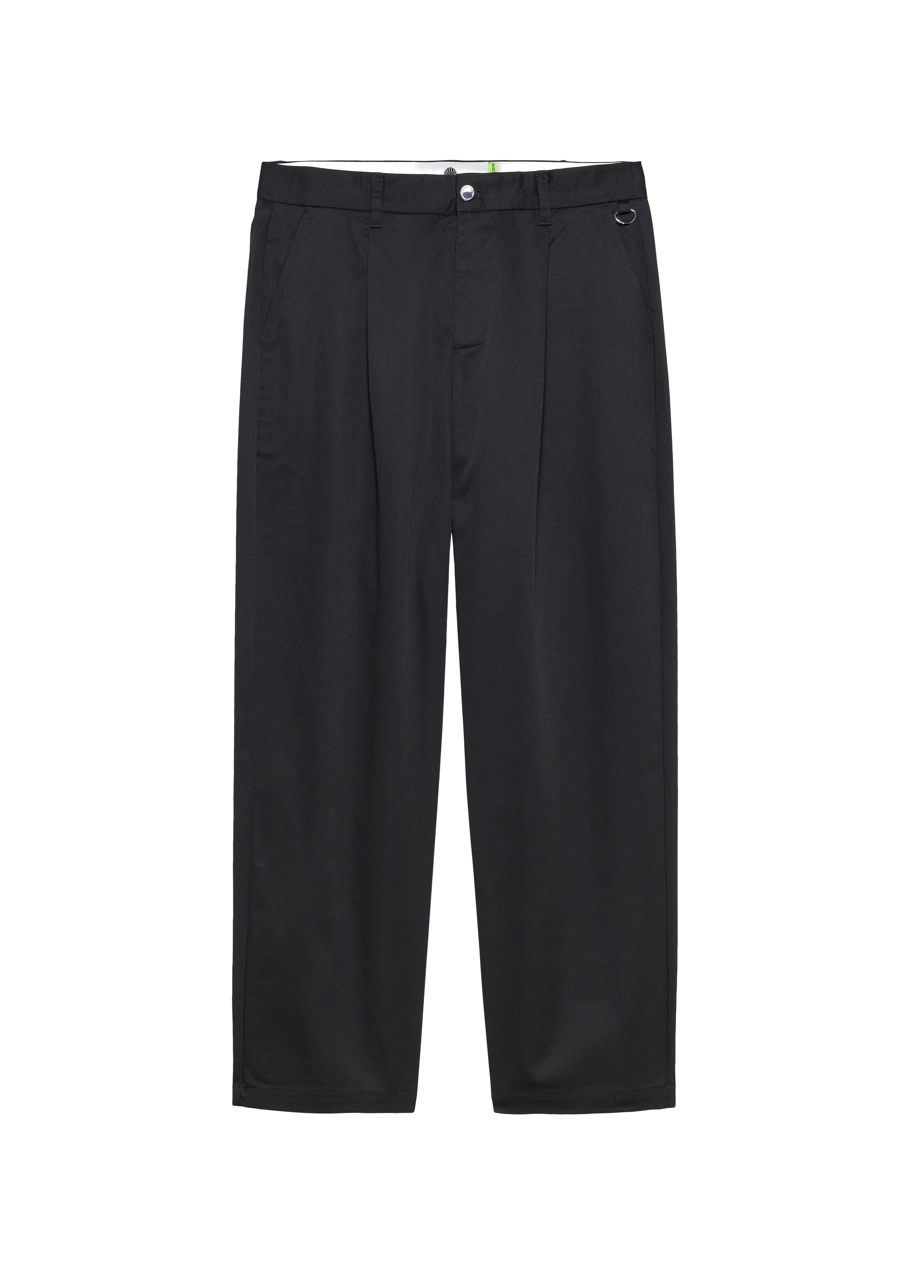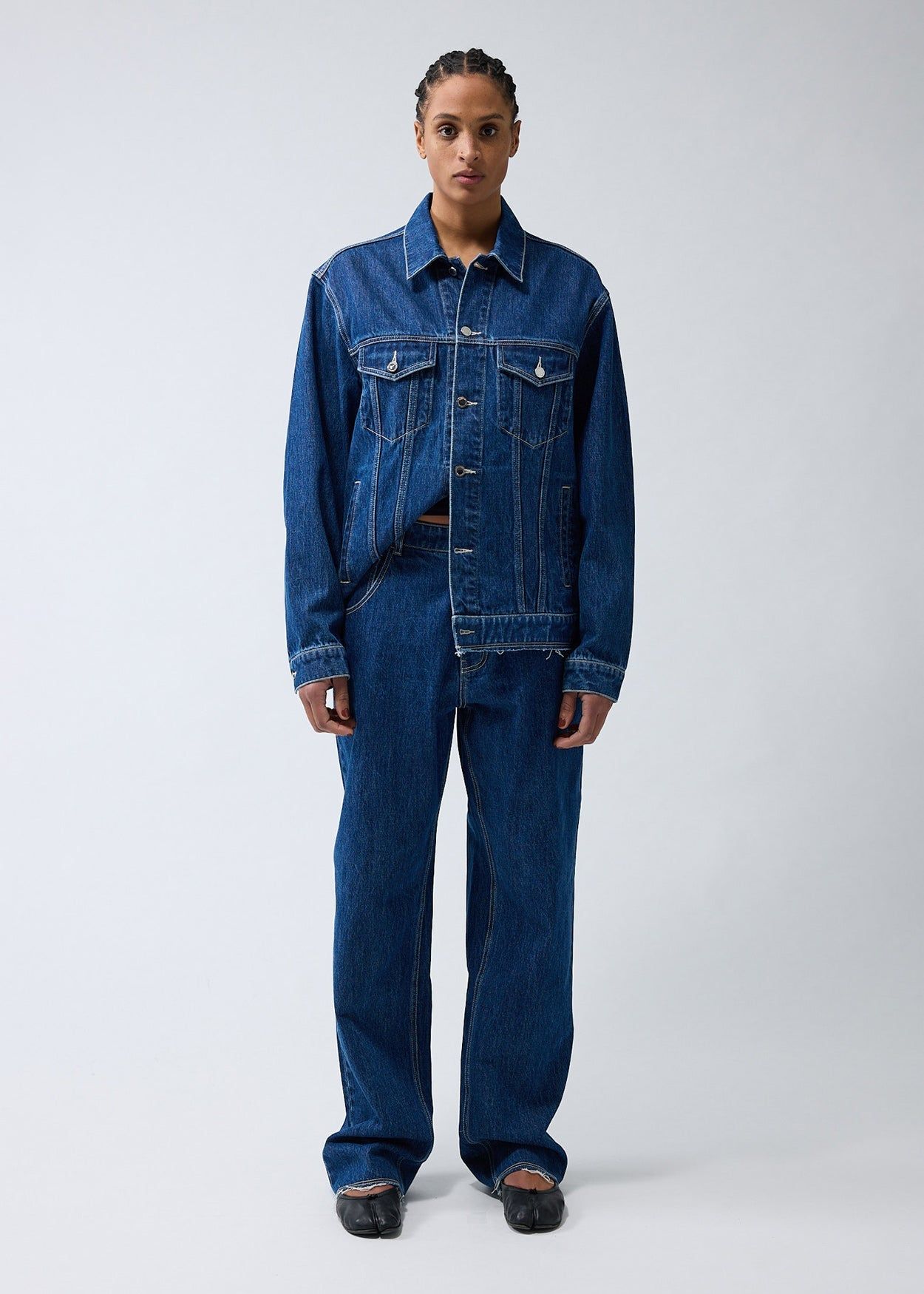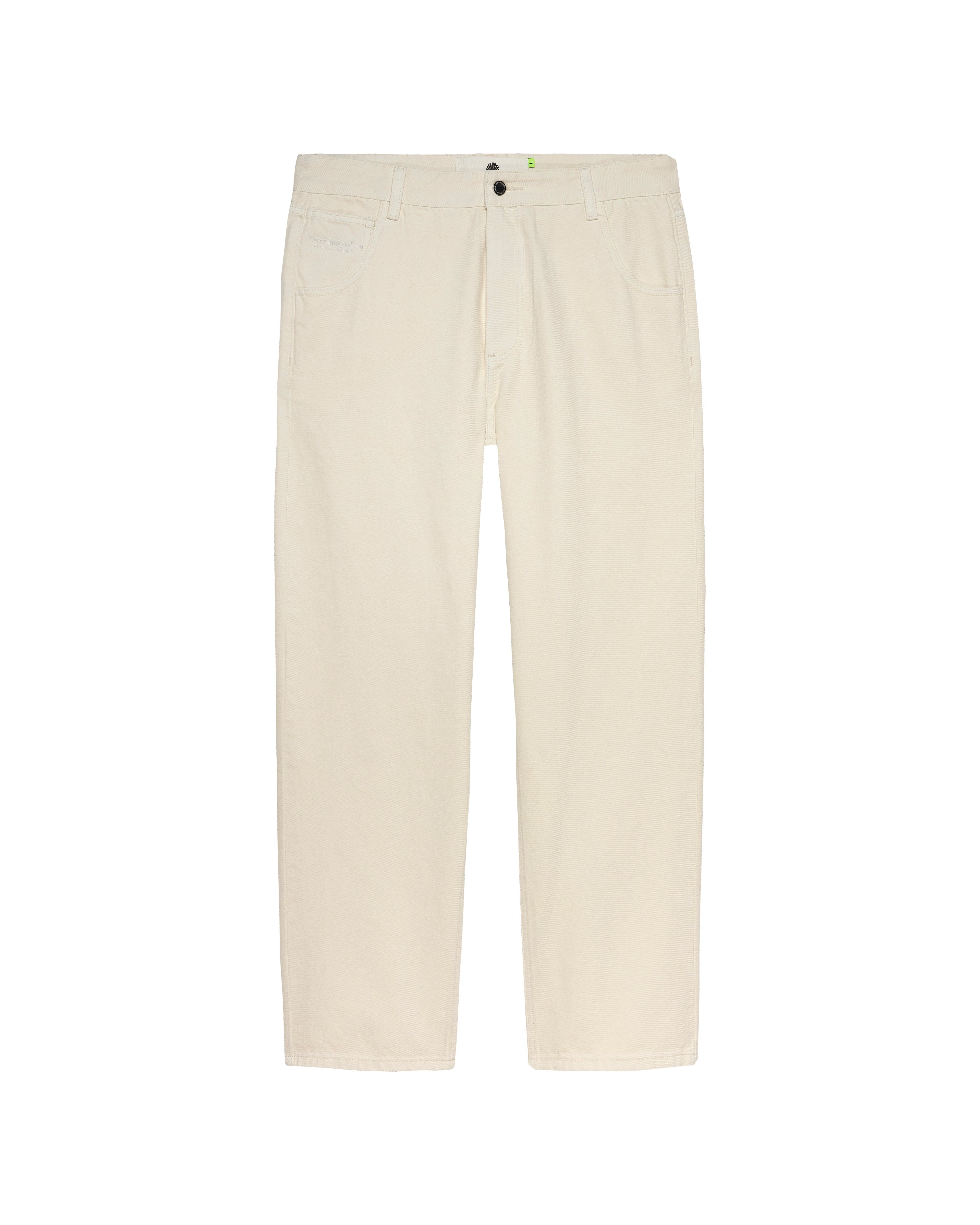 Denim trouser cut to a relaxed fit with a mid waist and a straight leg. The garment has a fixed waistband and is available in two lenghts. Detailed with a Metal branded button, raw edge bottom hem and New Amsterdam name embroidery above the left pocket. These pants are made out of a cotton denim.