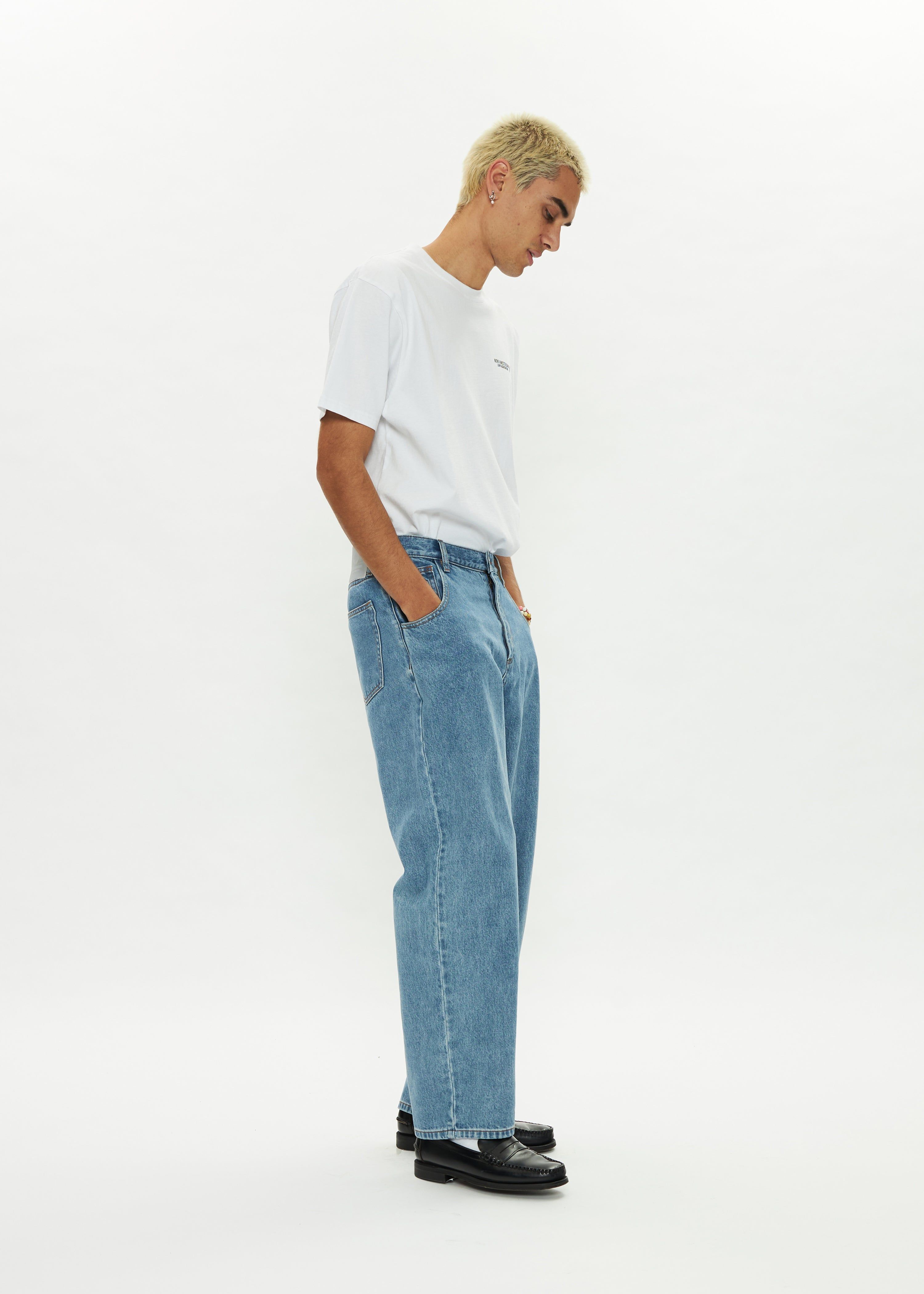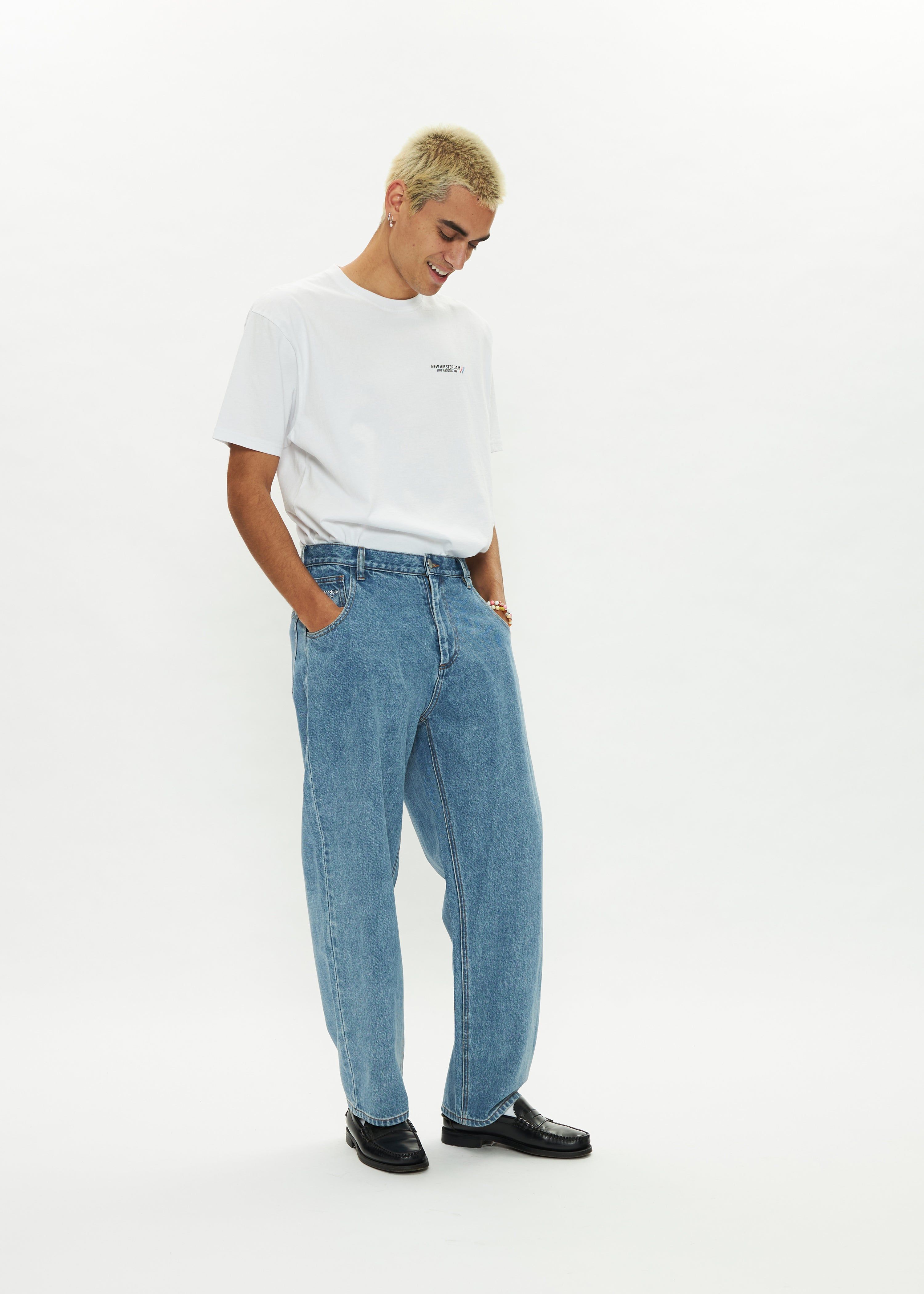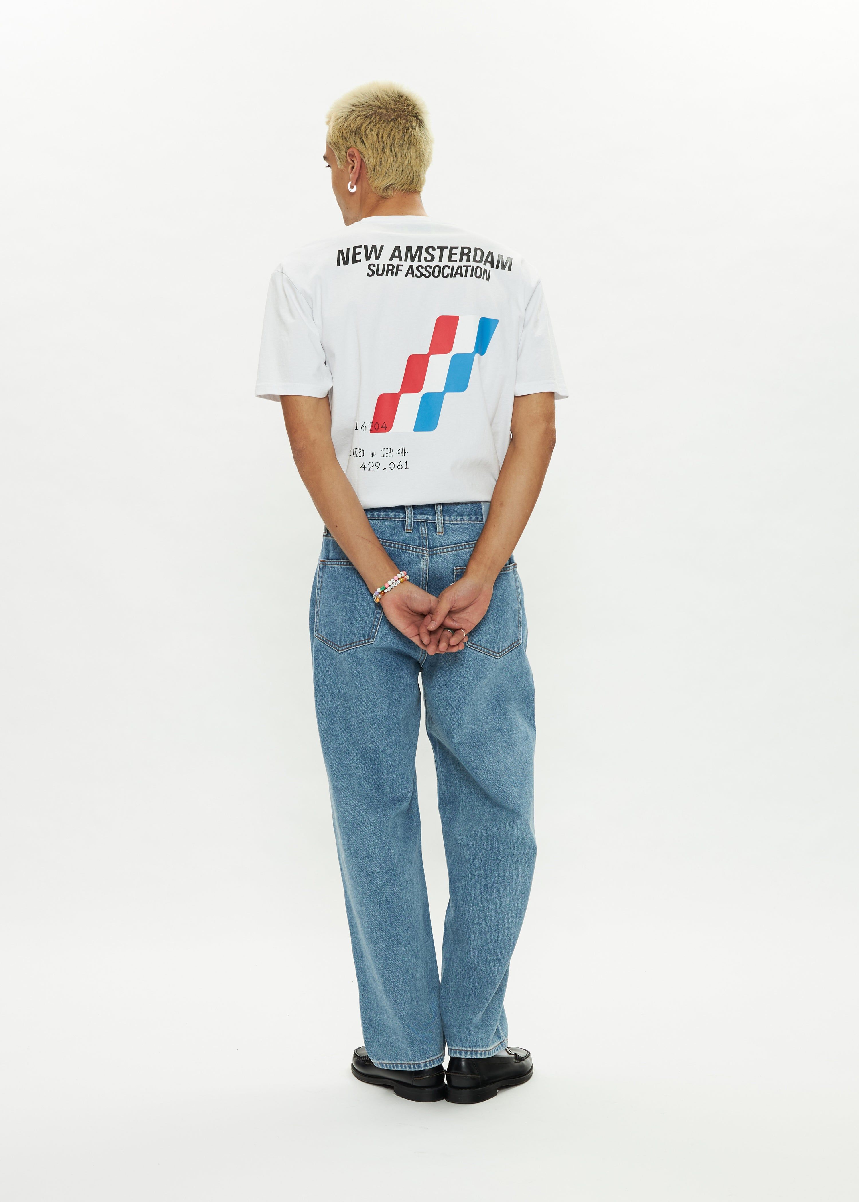 Denim trouser cut to a relaxed fit with a mid waist and a straight leg. The garment has a fixed waistband and is available in two lenghts. Detailed with a Metal branded button, and New Amsterdam name embroidery above the left pocket. These pants are made out of a cotton denim.