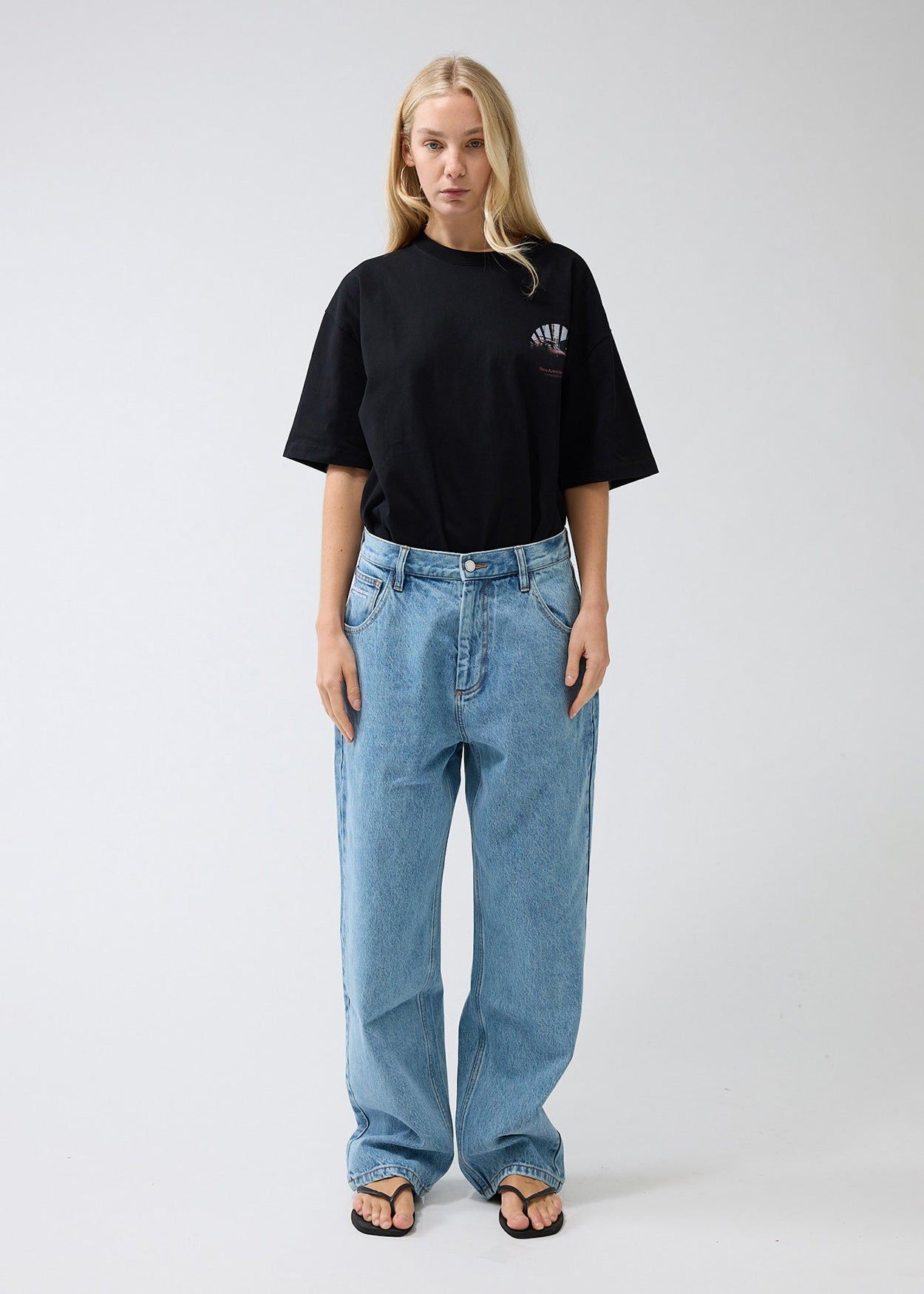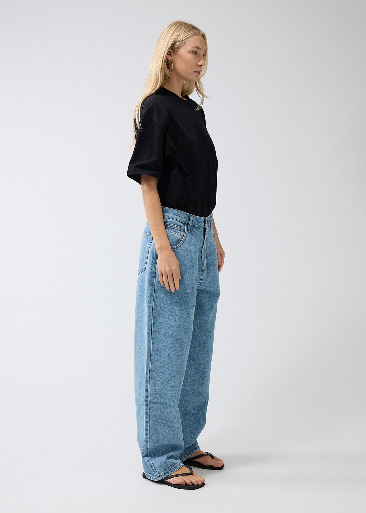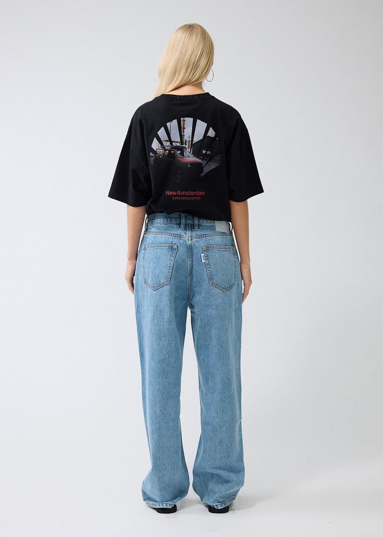 Denim trouser cut to a relaxed fit with a mid waist and a straight leg. The garment has a fixed waistband and is available in two lenghts. Detailed with a Metal branded button, and New Amsterdam name embroidery above the left pocket. These pants are made out of a cotton denim.